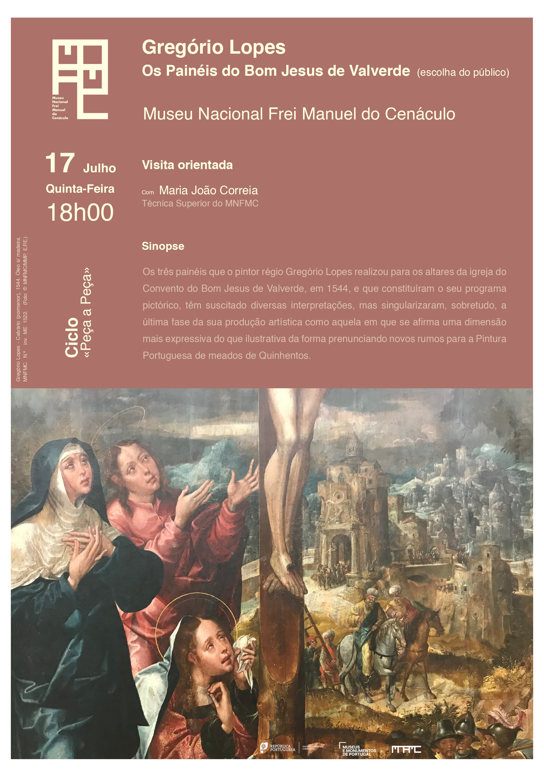 Maria João Correia, Técnica Superior do Museu, conduzirá a visita que tem a seguinte sinopse: “Os três painéis que o pintor régio Gregório Lopes realizou para os altares da igreja do Convento do Bom Jesus de Valverde, em 1544, e que constituíram o seu programa pictórico, têm suscitado diversas interpretações, mas singularizaram, sobretudo, a última fase da sua produção artística como aquela em que se afirma uma dimensão mais expressiva do que ilustrativa da forma prenunciando novos rumos para a Pintura Portuguesa de meados de Quinhentos.”