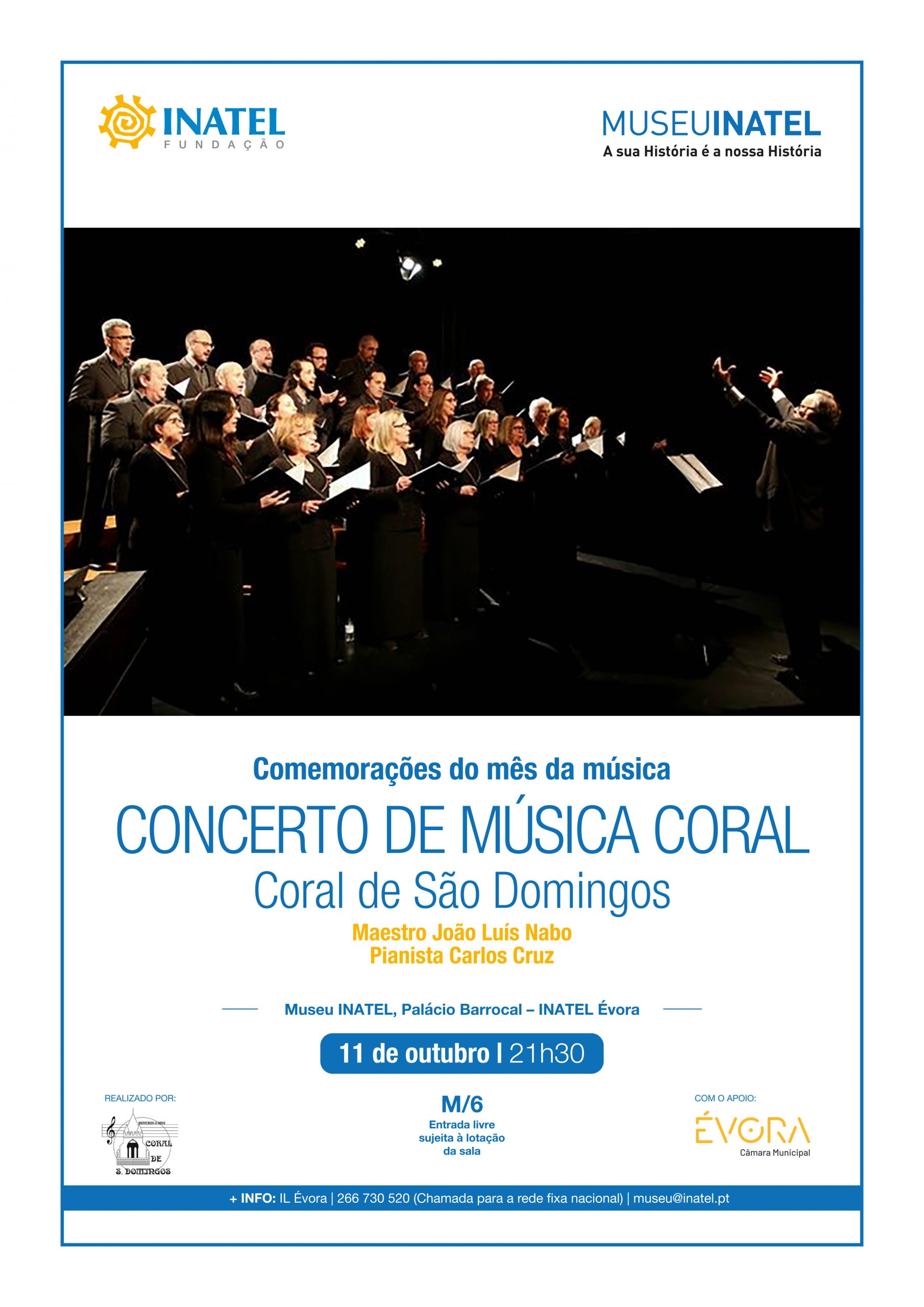 O Coral de S. Domingos, fundado por João Luís Nabo em 1987, realizou digressões por quase toda a Europa, participou em diversos concursos de renome e em dezenas de Encontros de Coros e Festivais por todo o País. Tem também colaborado com inúmeros artistas. Apresentam uma discografia distinta e marcam presença em eventos notáveis. Do seu extenso reportório fazem parte peças populares e eruditas, de origem sacra e profana, tantos nacionais como estrangeiras, das mais diversas épocas e escolas que poderemos ouvir neste concerto comemorativo do mês da música, dirigido pelo maestro João Luís Nabo e acompanhado pelo pianista Carlos Cruz.