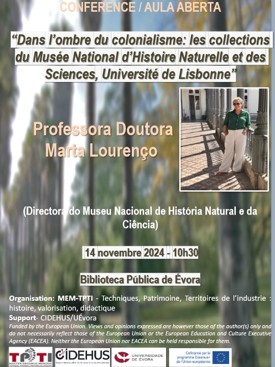 No âmbito do mestrado Erasmus Mundus TPTI ( Techniques, Patrimoine et Territoires de Industrie/Técnicas, Património e Territórios da Indústria ), em colaboração com o CIDEHUS, decorrerá na BPE uma conferência com a Professora Doutora Marta Lourenço, Diretora do Museu de História Natural e da Ciência.