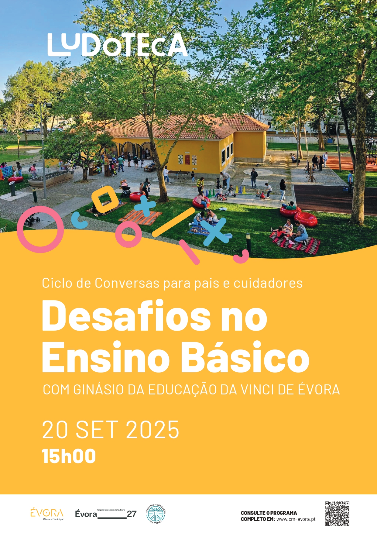 A Ludoteca promove o ciclo de conversas “Desafios no Ensino Básico”, dinamizado pelo Ginásio da Educação Da Vinci de Évora, dirigido a pais, cuidadores e profissionais com interesse na temática, constituindo uma reflexão sobre metas e organização para auxiliar os estudantes em casa.