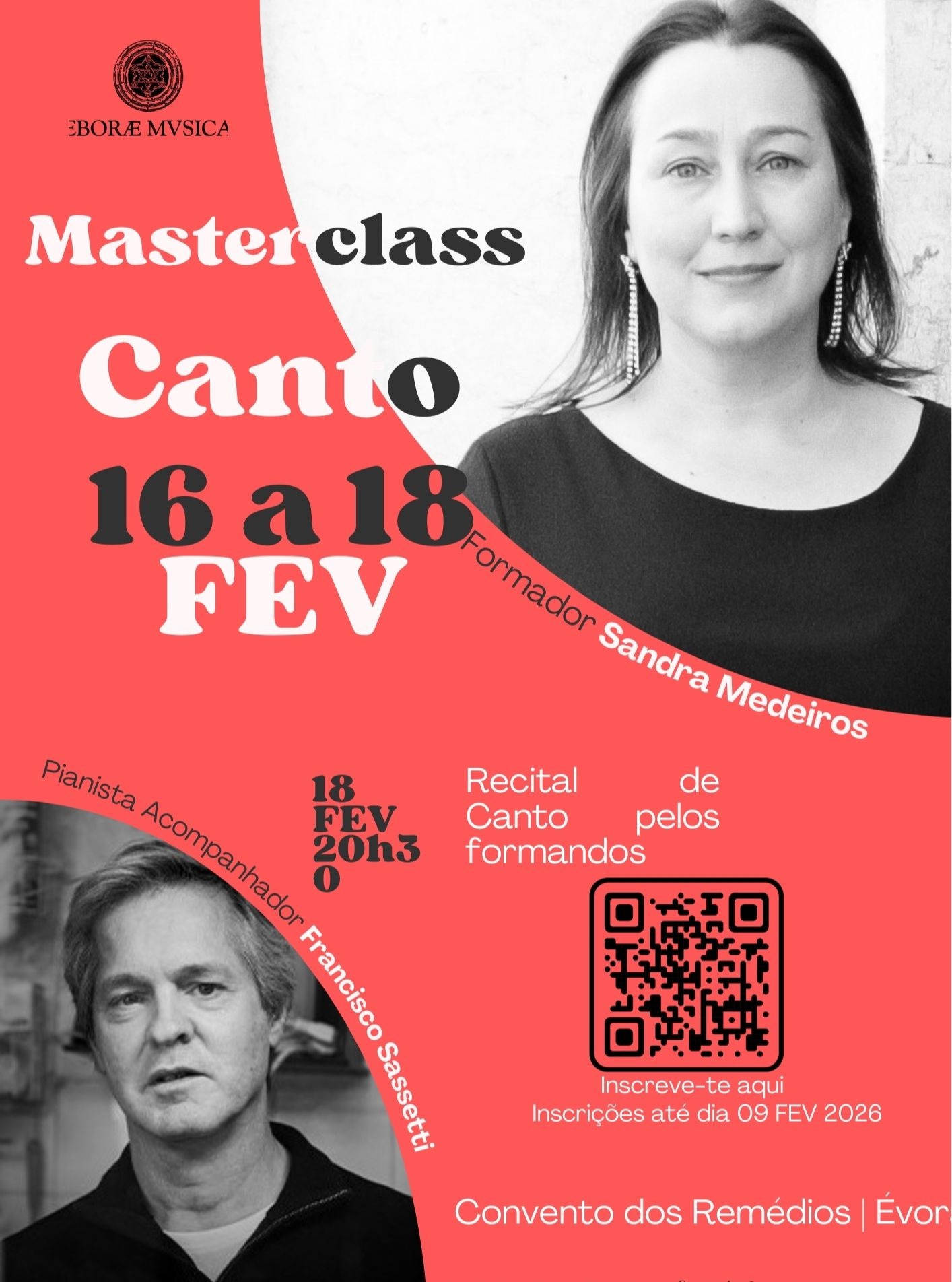A orientadora desta masterclass é Sandra Medeiros, e o pianista acompanhador é Francisco Sassetti.