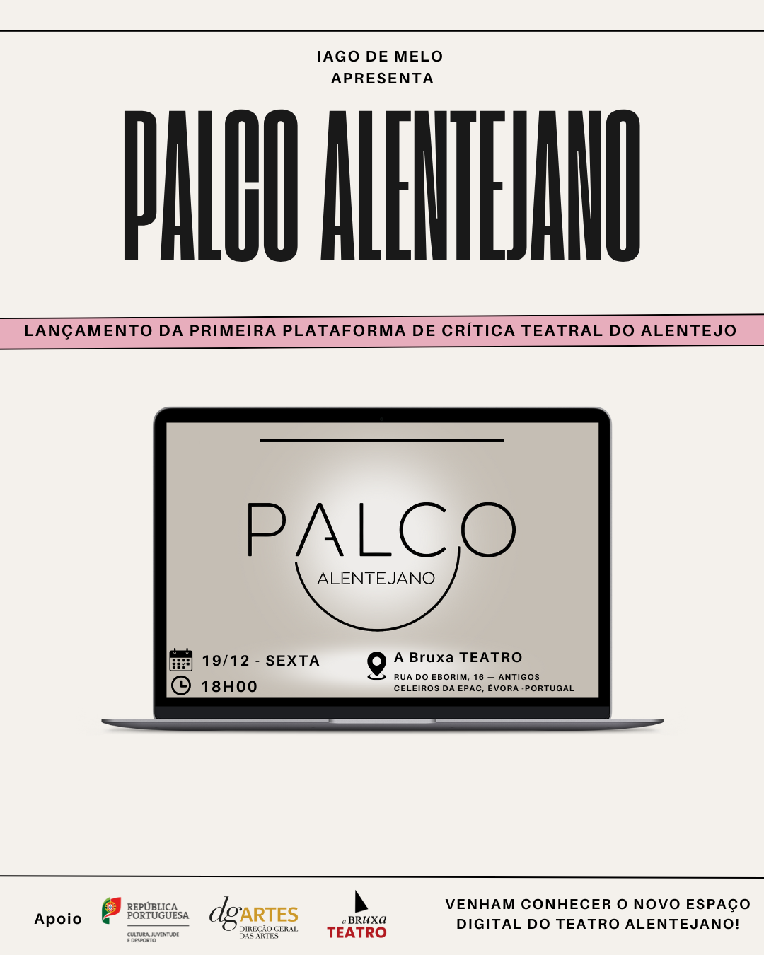 O lançamento da plataforma digital Palco Alentejano apresenta um projeto pioneiro para a cena cultural do Alentejo Central, como a primeira plataforma de crítica teatral inteiramente dedicada à análise, reflexão e valorização do teatro da região. Concebida e dirigida por Iago de Melo, a iniciativa surge com o propósito de recuperar a importância da crítica teatral enquanto instrumento estético, histórico e sociocultural, reafirmando o seu papel fundamental no diálogo artístico da região. Apoiado pela Direção Geral das Artes – DGARTES – República Portuguesa – Cultura, o Palco Alentejano propõe-se inaugurar um novo capítulo na relação do público com o teatro alentejano.