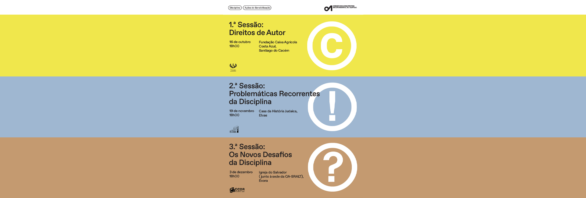 A Secção Regional do Alentejo da Ordem dos Arquitectos (OASRALT) dedica o último trimestre do ano às questões da Disciplina, com um Ciclo de Sessões de Esclarecimento. Este ciclo tem como objetivo sensibilizar e alertar os membros para: os Direitos de Autor, Problemáticas Recorrentes da Disciplina e Novos Desafios.