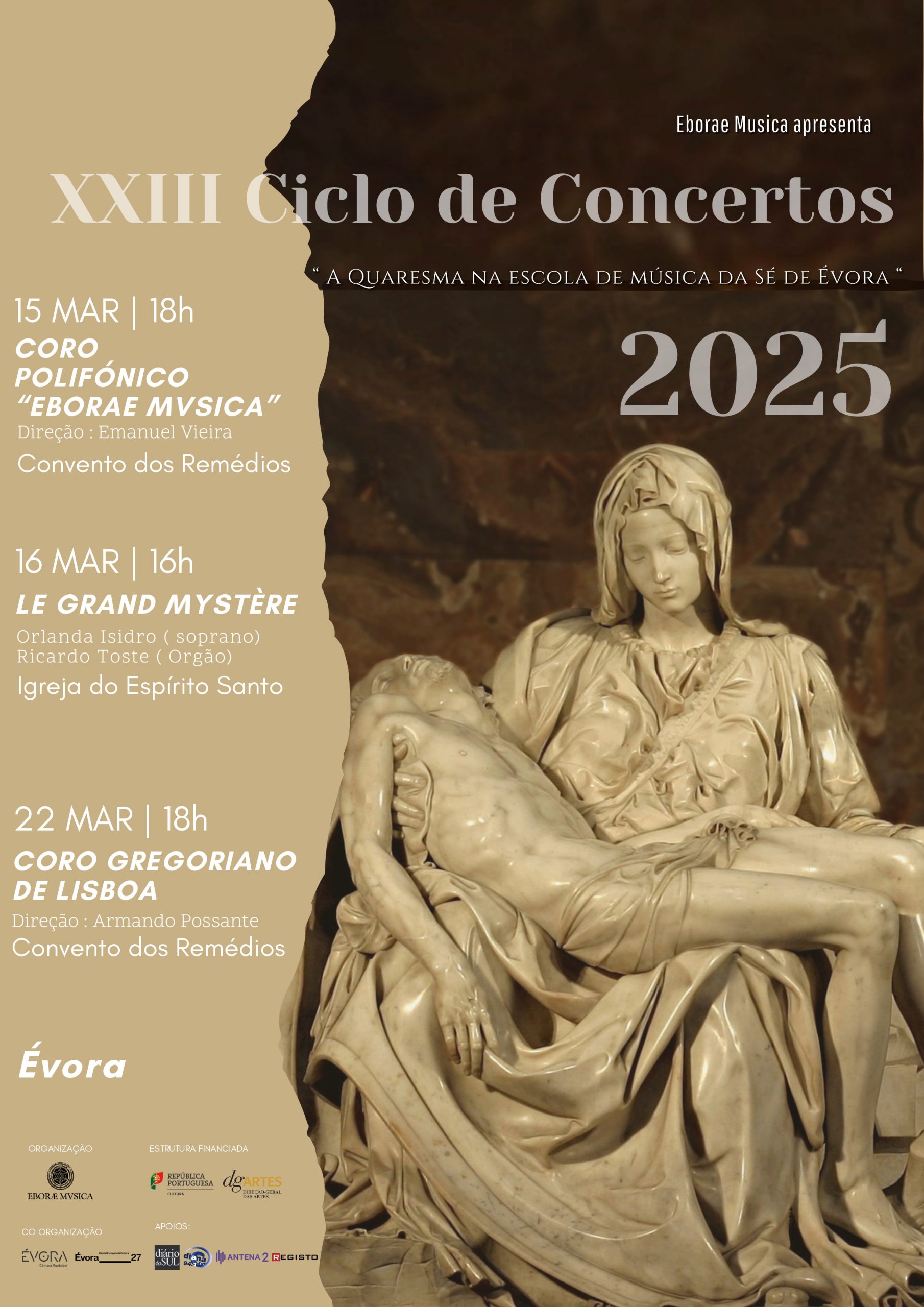 A Associação Eborae Mvsica promove o XXIII Ciclo de Concertos “A Quaresma na Escola de Música da Sé de Évora” nos dias 15 e 22 de março, às 18h00, no Convento dos Remédios e no dia 16 de março, às 16h00, na Igreja do Espírito Santo, Évora.
