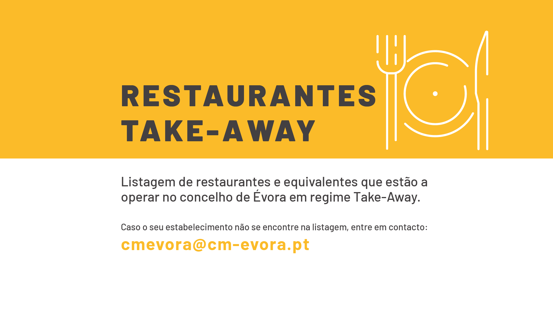 Considerando o encerramento temporário de grande parte das empresas de restauração por força da pandemia Covid-19, a Câmara Municipal de Évora, em colaboração com a AHRESP – associação da hotelaria, restauração e similares de Portugal, disponibiliza uma listagem de restaurantes e equivalentes que estão a operar no concelho de Évora.