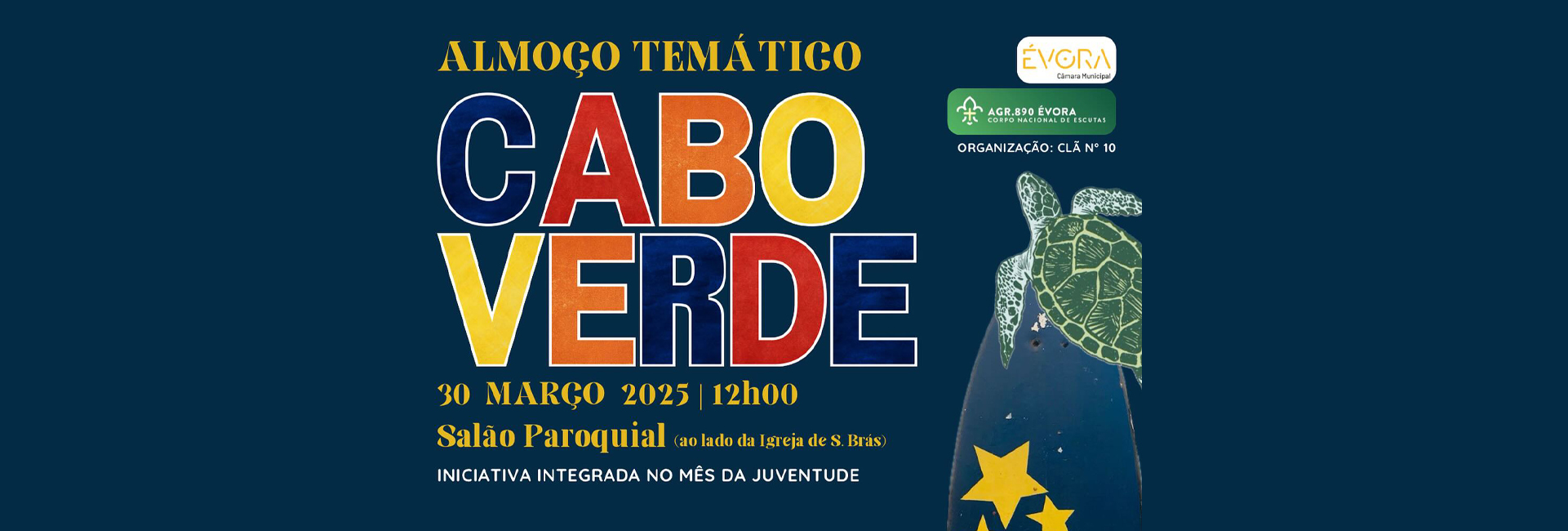 No próximo dia 30 de março, pelas 12h00 no Salão Paroquial ao lado da Igreja de São Brás, o Clã do agrupamento 890 de Évora, irá realizar um almoço temático Cabo Verde! Toda a receita reverterá para a atividade de serviço em Cabo Verde dos nossos caminheiros.