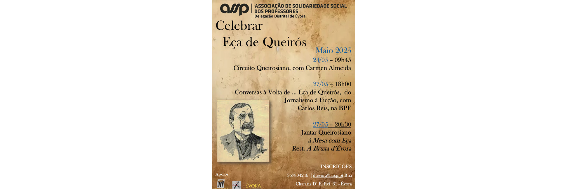 Dia 24, Carmem Almeida, com a colaboração do Cendrev, irá orientar um Circuito Queirosiano, conduzindo-nos pelos passos de Eça na Cidade.