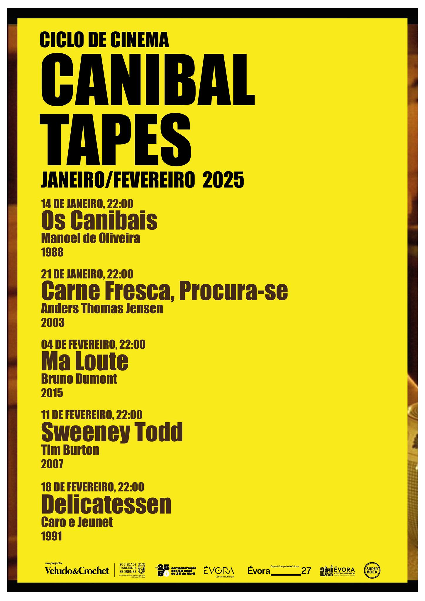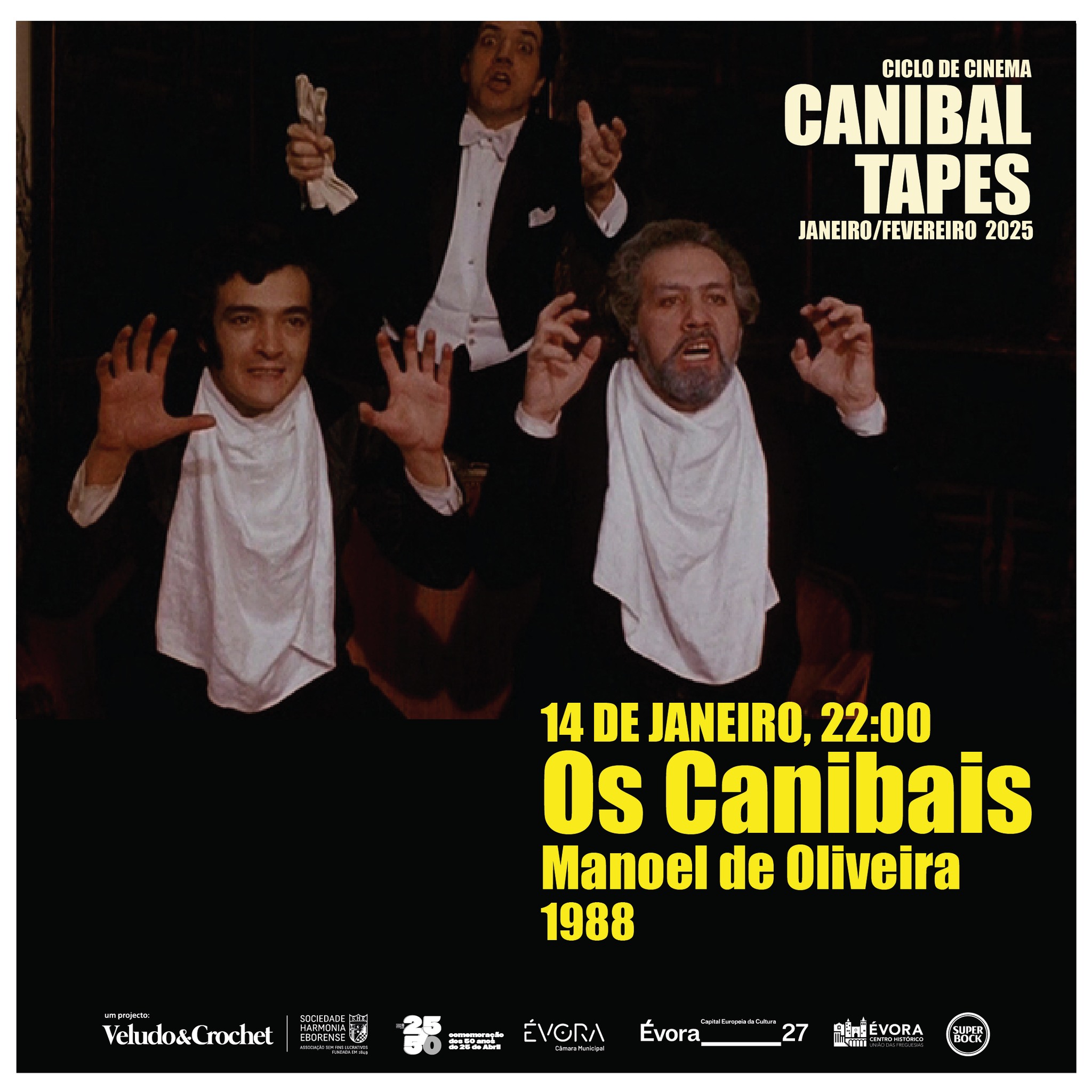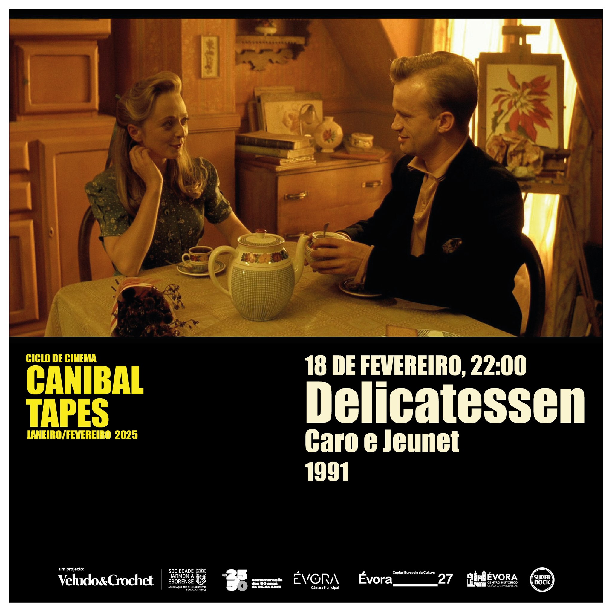 Canibal Tapes – Nos subterrâneos da cultura ocidental onde medos e tabus habitam, a antropofagia ocupa um lugar especial, entre dominação selvagem e devoração revolucionária, entre exotismo e consumismo, entre segredo e ostensão. Dominado pela visão eurocêntrica, o canibal é sempre um outro transgressor a quem se impõe a ordem pela força da Lei. Mesmo assim, o canibalismo foi muitas vezes tratado ao serviço do cómico e da sátira, como acontece na «Proposta Modesta» de Jonathan Swift (1729), ou de forma muito evidente no cinema. É o caso dos cinco fimes deste ciclo, pautados pelo excesso grotesco e caricatural das suas personagens, pelo humor denso e corrosivo das suas narrativas e pelo riso libertário e político que lhes dá resolução. Ficam, pois, convidados para partilhar cada um dos banquetes destas Canibal Tapes.