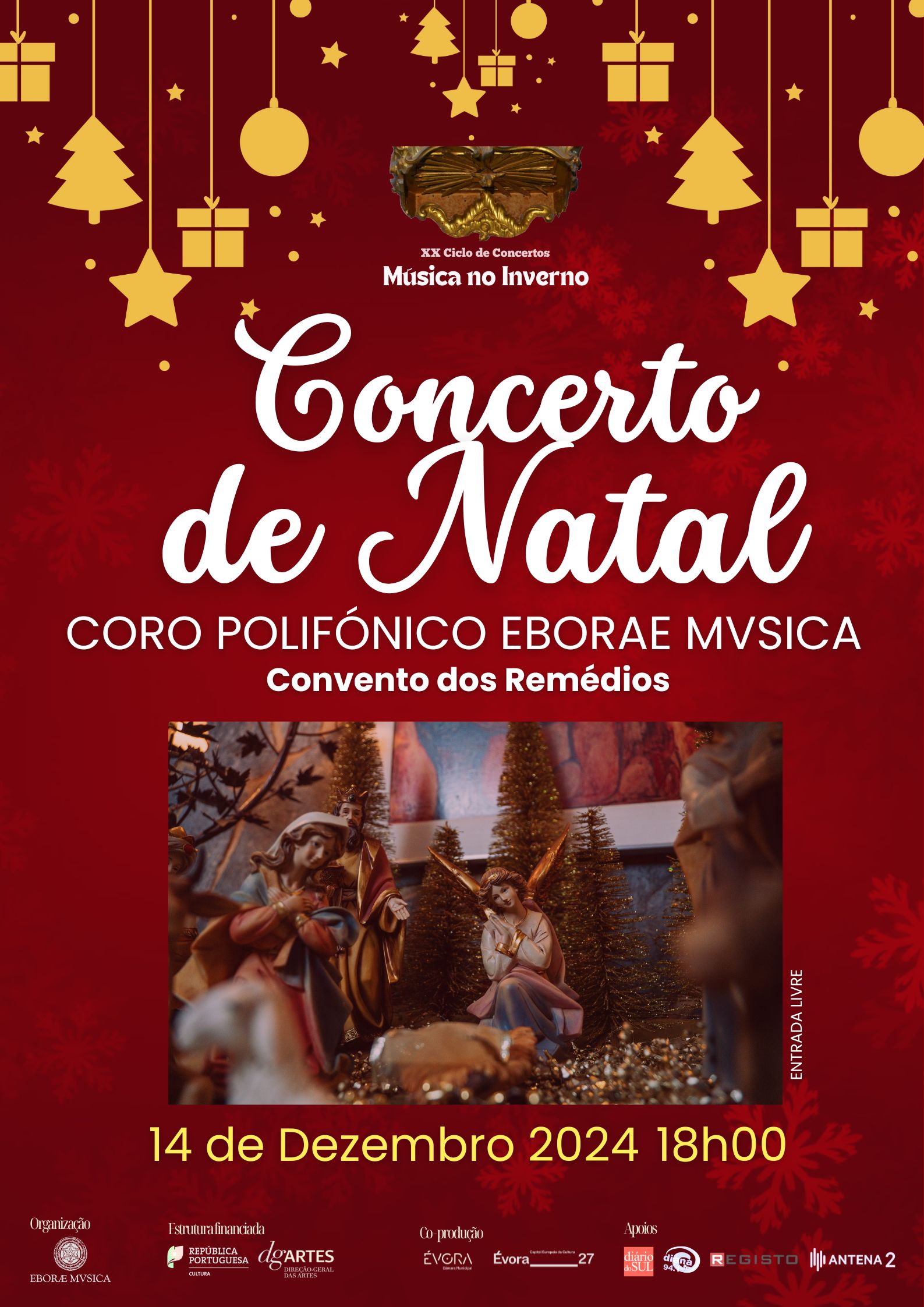 No dia 14 de dezembro, terá lugar o Concerto de Natal pelo Coro Polifónico Eborae Mvsica (dir. Emanuel Vieira).