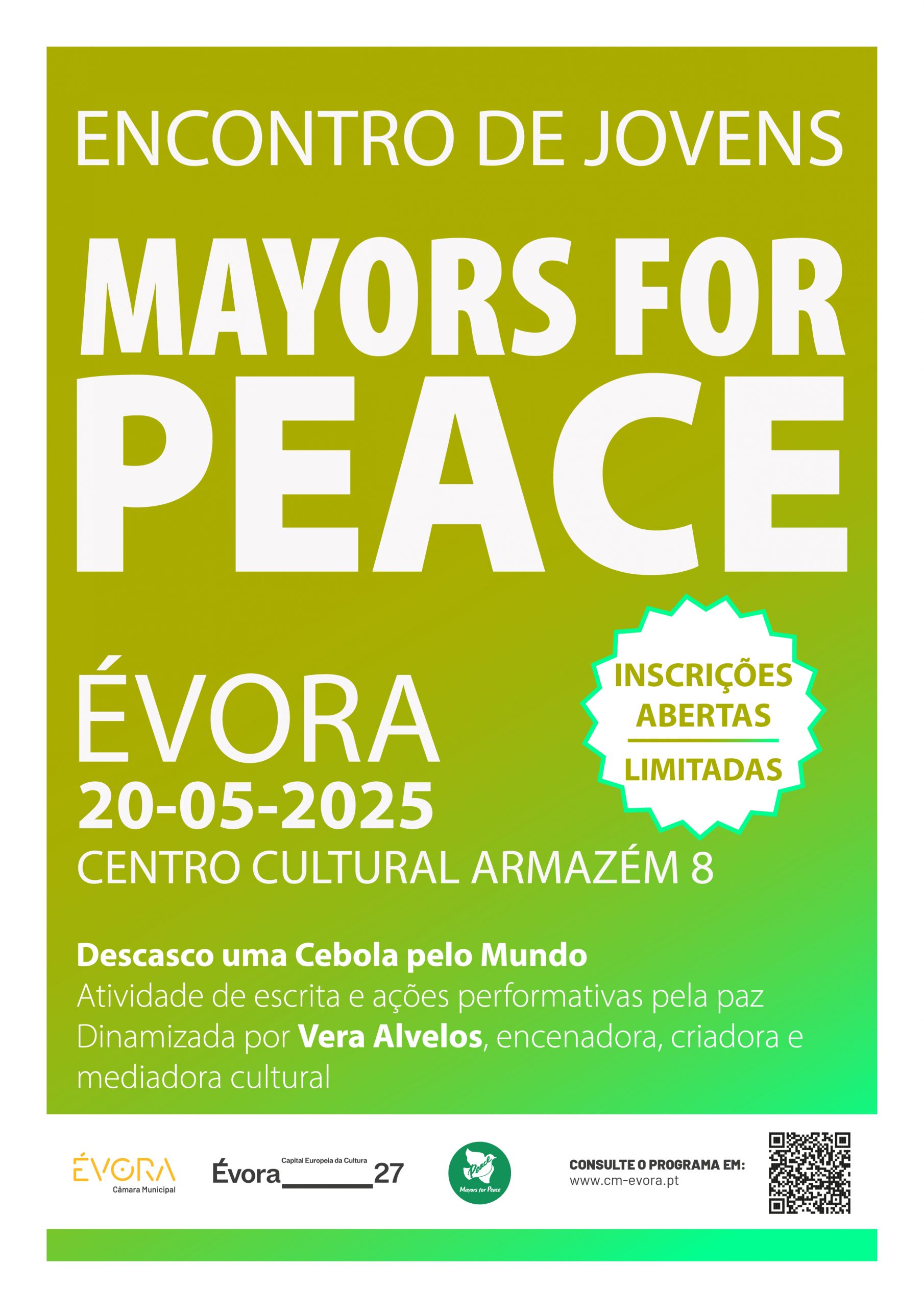 Tendo como pano de fundo o tema Vagar, que inspira o conceito de Évora 2027 – Capital Europeia da Cultura, e assinalando-se em 2025 o 80.º aniversário do bombardeamento atómico de Hiroshima e Nagasaki, a Câmara Municipal de Évora irá organizar nos dias 20 e 21 de maio um Encontro de Jovens da Mayors for Peace e a Conferência “Então e a Paz?. Estas iniciativas têm como objetivo incentivar a reflexão em torno da cultura de paz e do papel que a cultura, a educação e as artes desempenham na sua promoção.