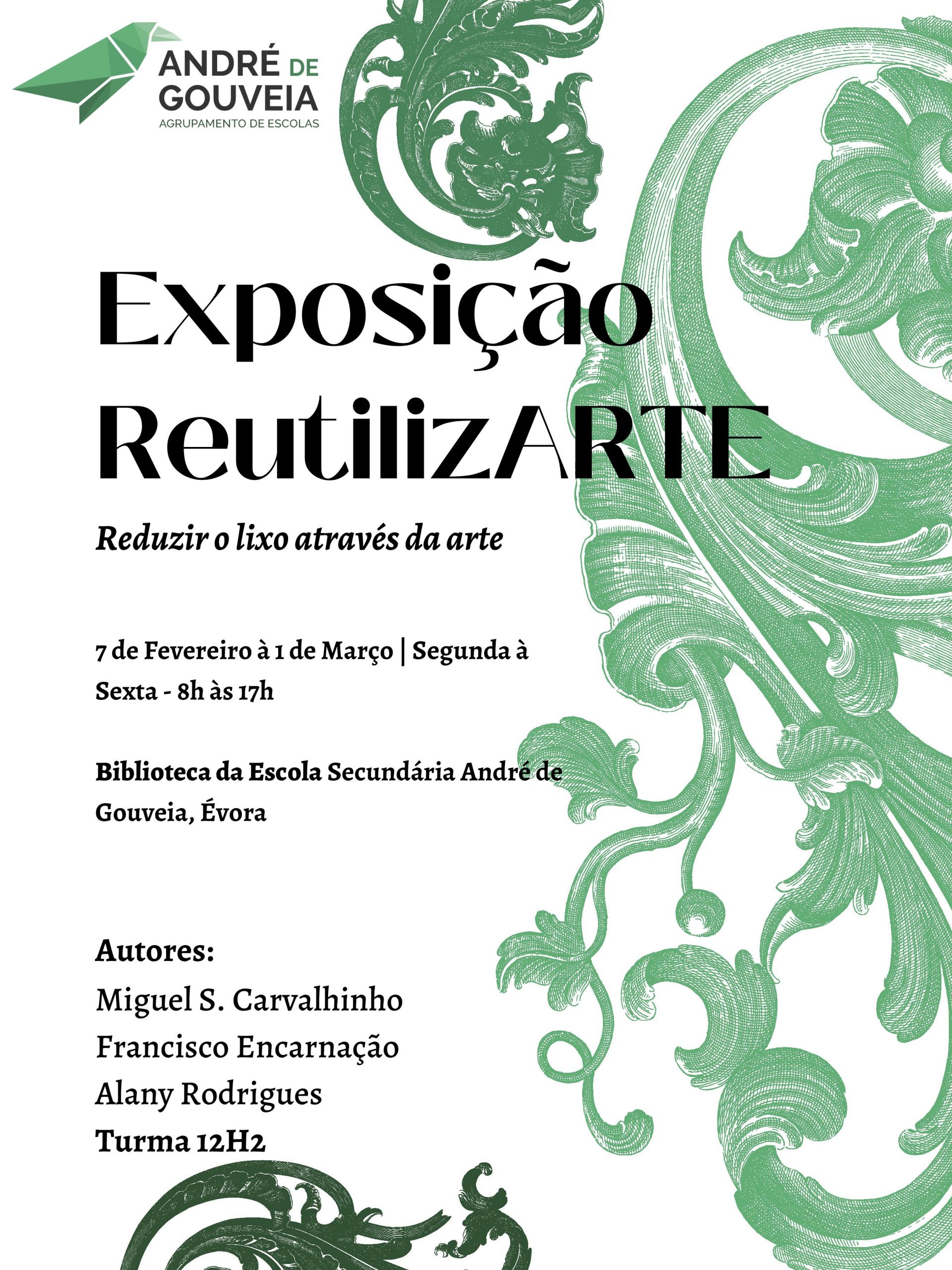 A exposição “ReutilizARTE”, organizada pelos alunos Miguel, Francisco e Alany, do 12º H2 da ESAG, tem por objetivo sensibilizar a população escolar – alunos, professores auxiliares e famílias – para a importância da reutilização e do upcycling na redução do desperdício e do lixo.