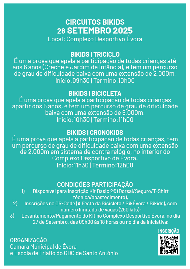 2. Inscrições neste link (A Festa da Bicicleta / BikÉvora / Bikids), com número limitado de vagas (250 kits);