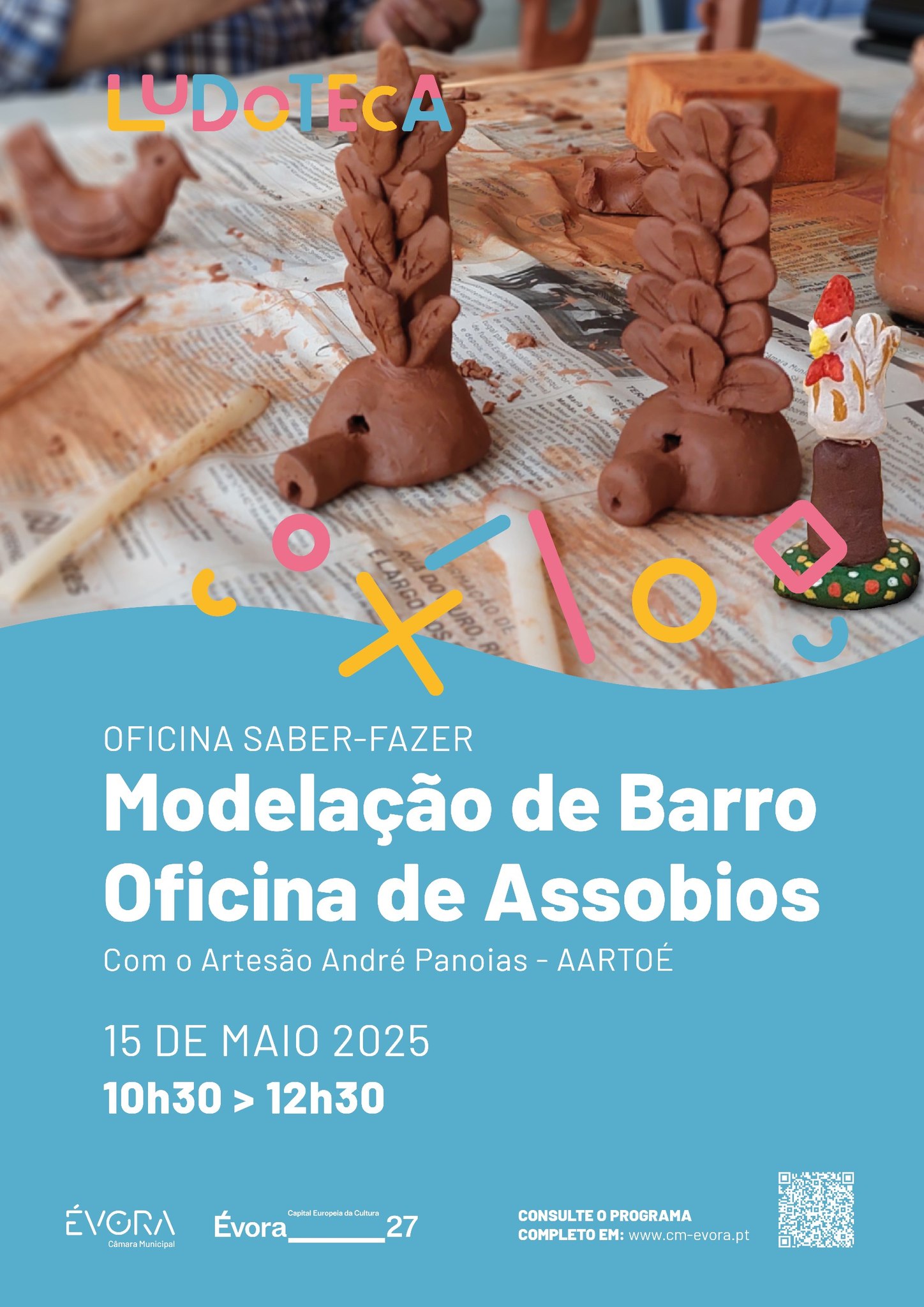 Nesta atividade, as crianças terão a oportunidade de aprender sobre os tradicionais Assobios de Estremoz, figuras de barro modeladas em formas de animais, plantas, entre outros, que fazem parte da rica herança cultural do Alentejo. Com uma história que remonta a mais de três séculos, os Bonecos de Estremoz são uma das expressões artísticas mais emblemáticas da região e, em 2017, foram reconhecidos pela UNESCO como Património Cultural Imaterial da Humanidade. Ao longo da atividade, as crianças aprenderão a técnica de modelação, explorando de forma criativa as formas e cores dos assobios, que refletem o quotidiano rural e urbano das gentes alentejanas.