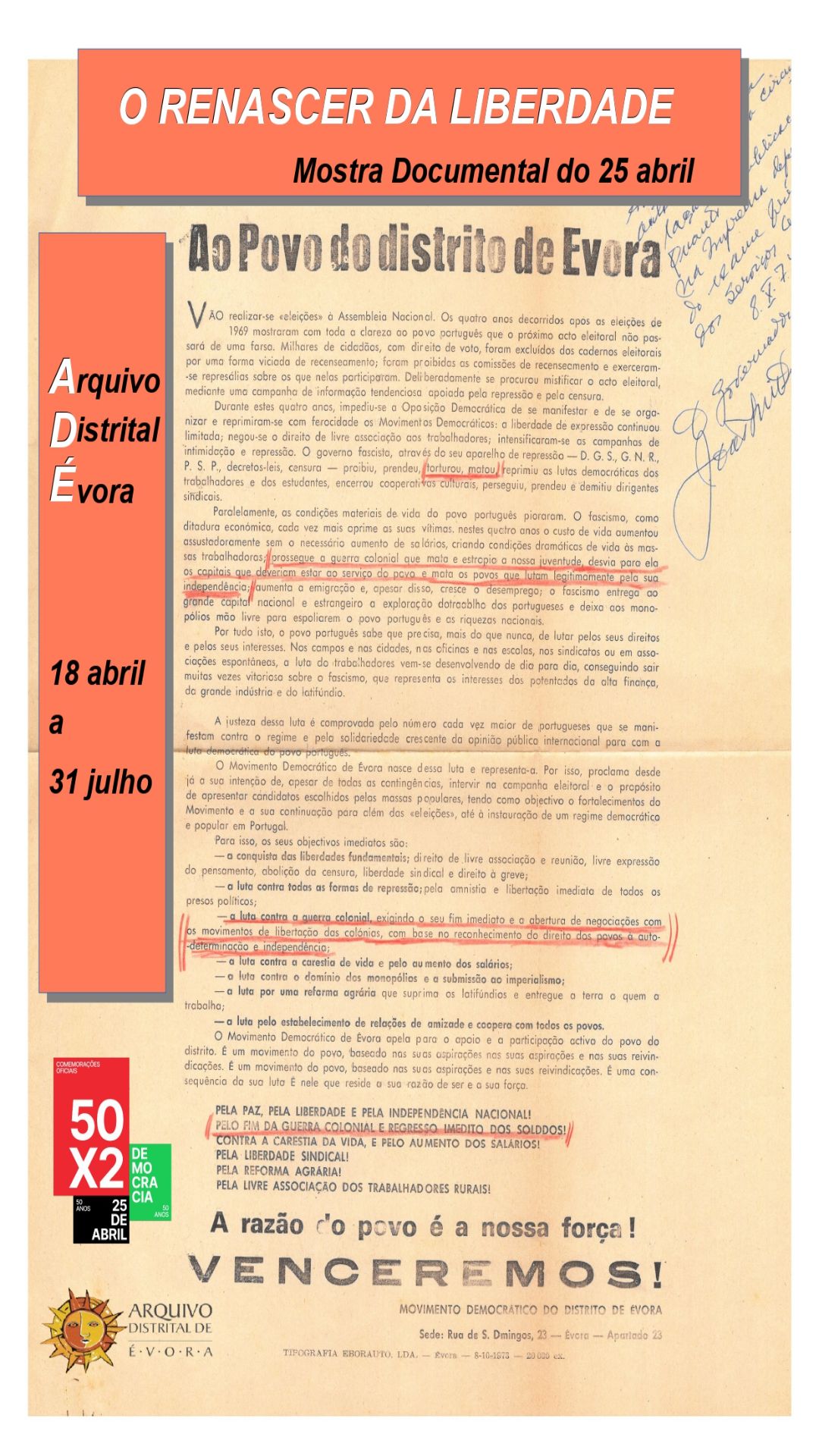Nesta Mostra Documental o Arquivo Distrital de Évora divulga documentação relativa ao contexto da Revolução dos Cravos. Procura-se também, como contraponto, recuperar o ambiente repressivo vivido durante os finais do Estado Novo e, ao mesmo tempo, mostrar a determinação e a ousadia de quem resistia à opressão e queria ser livre.