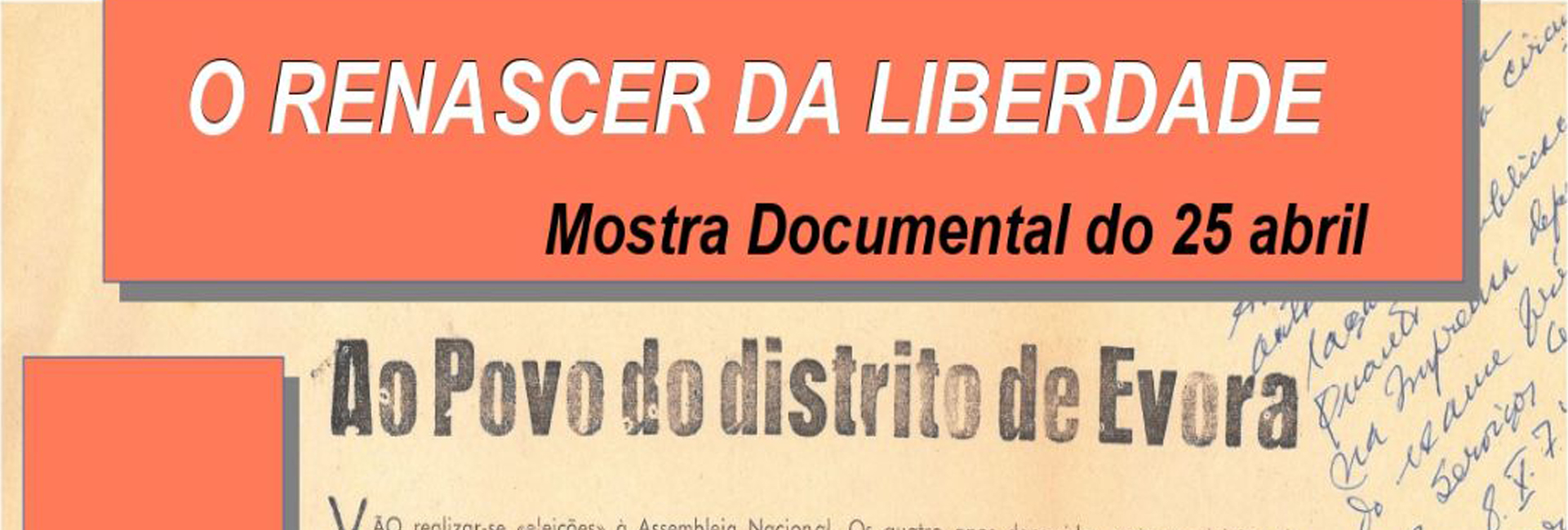 A Mostra Documental “25 de Abril: O Renascer da Liberdade”, promovida pelo Arquivo Distrital de Évora, enquadra-se nas comemorações do cinquentenário da Revolução iniciada no dia 25 de Abril de 1974, que devolveu a Liberdade e a Democracia ao povo português, após 48 anos de vigência do autoritarismo. As mudanças ocorridas na Revolução foram bruscas e profundas.