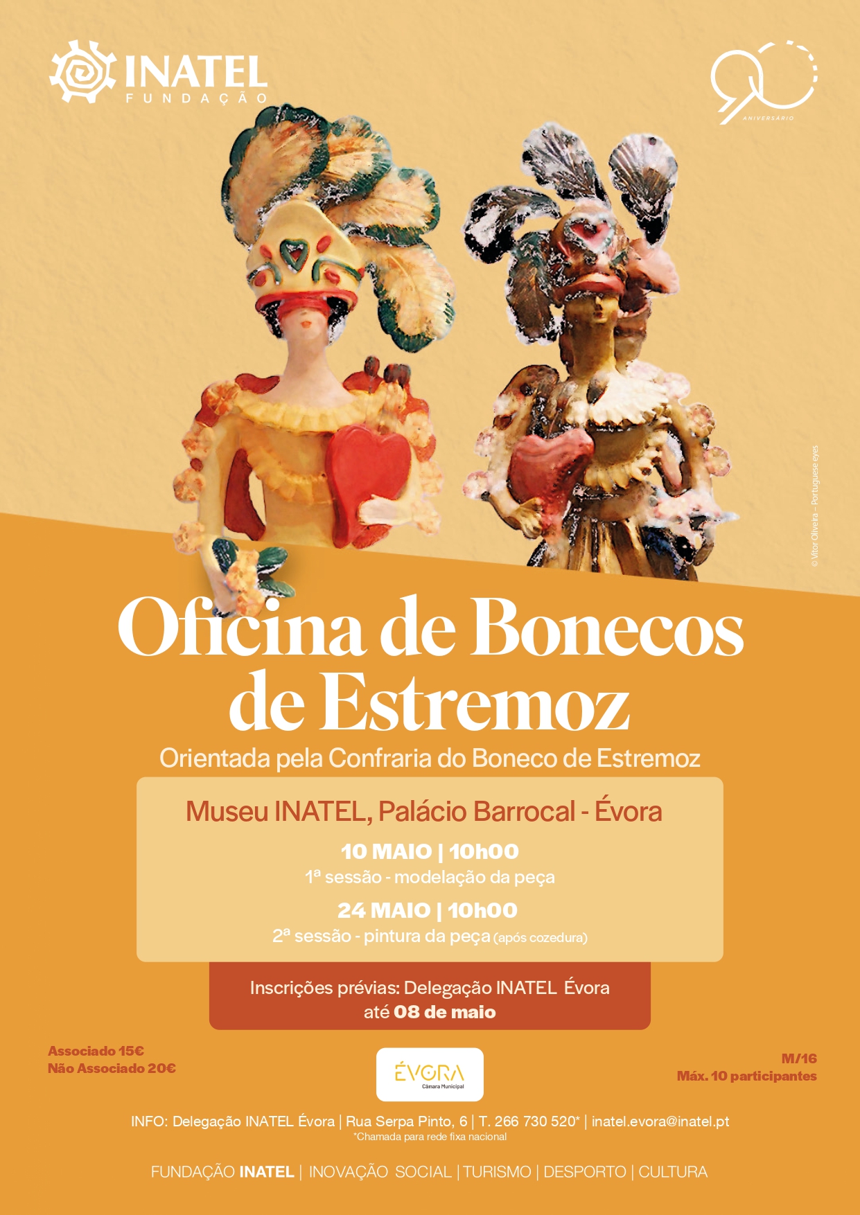 A Oficina de modelação de um Boneco de Estremoz tem como objetivo promover, divulgar e valorizar o Boneco de Estremoz. Será ensinado aos participantes, numa primeira sessão, a modelação de um Boneco de Estremoz. Após a modelação a peça será cozida, voltando-se a reunir o grupo numa segunda sessão para a pintura do Boneco.
