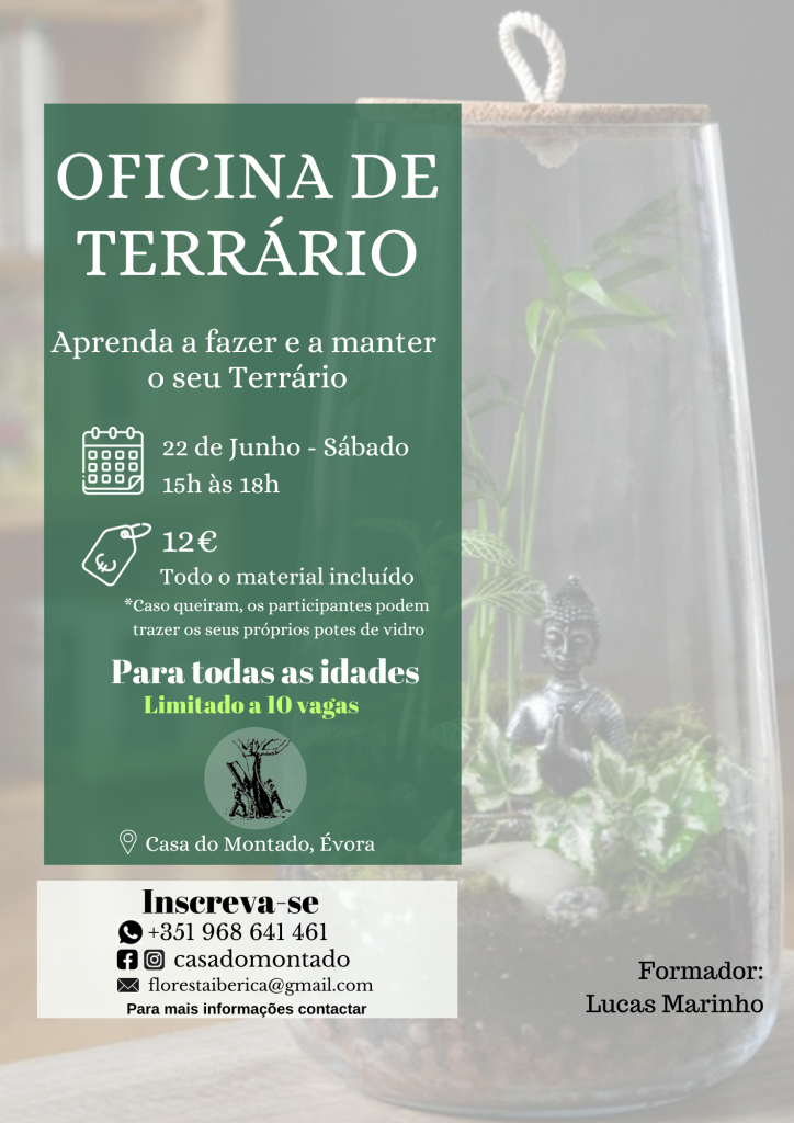 Esta oficina irá ensinar os participantes a criarem belos terrários através da utilização de materiais facilmente disponíveis no dia a dia. Os participantes aprenderão sobre a história desta arte, suas técnicas e a sua relação com a ciência! ︎Se queres aprender a construir mini “paisagens” com materiais reutilizados e também provenientes do Montado, esta oficina é para ti! ︎