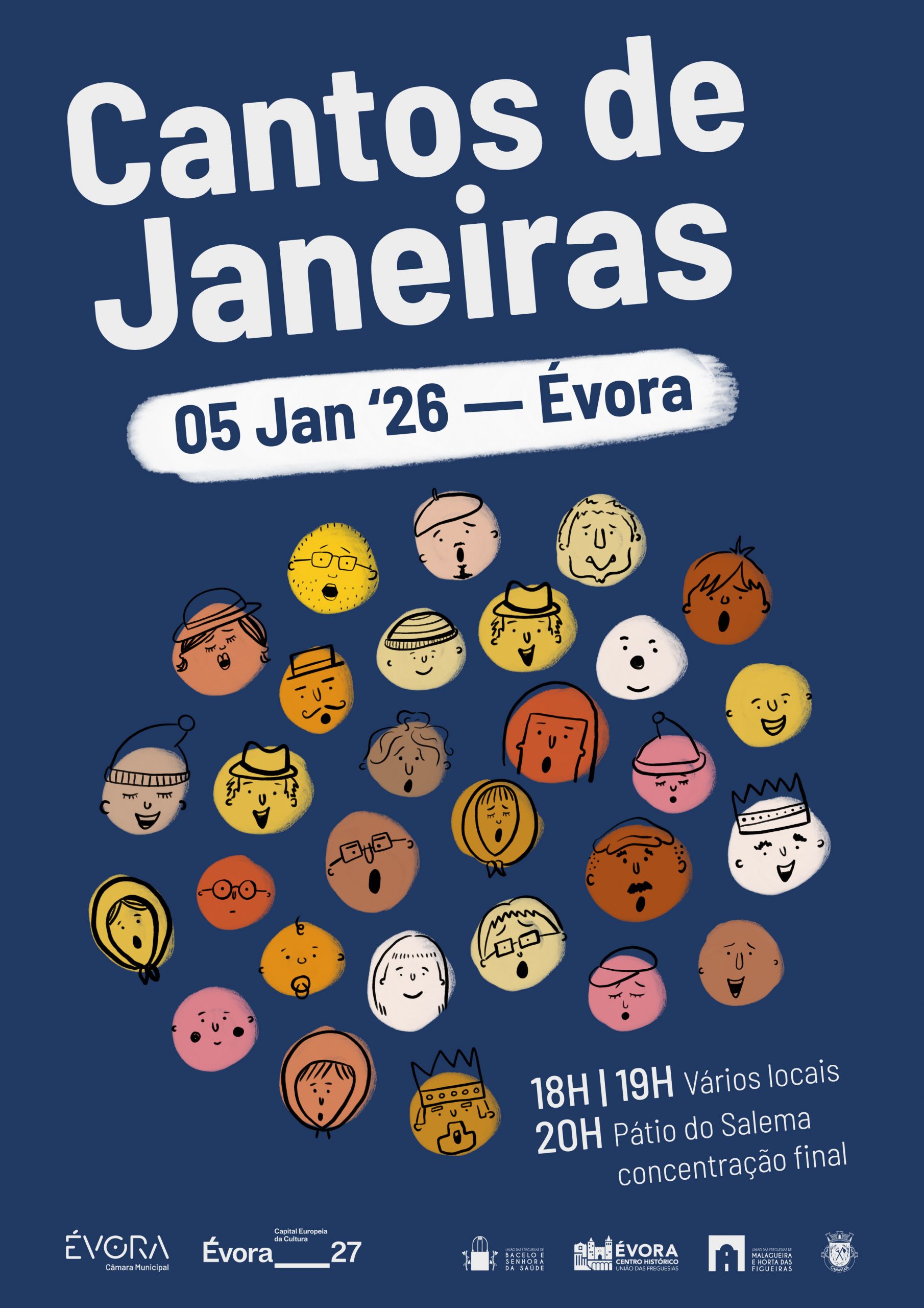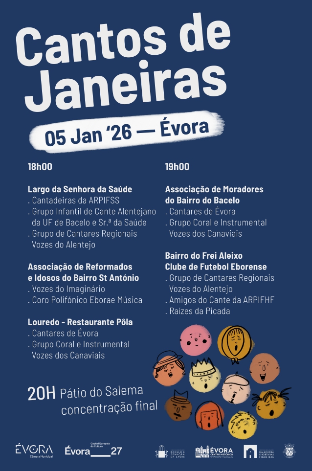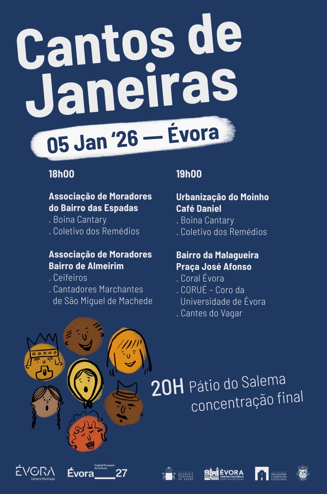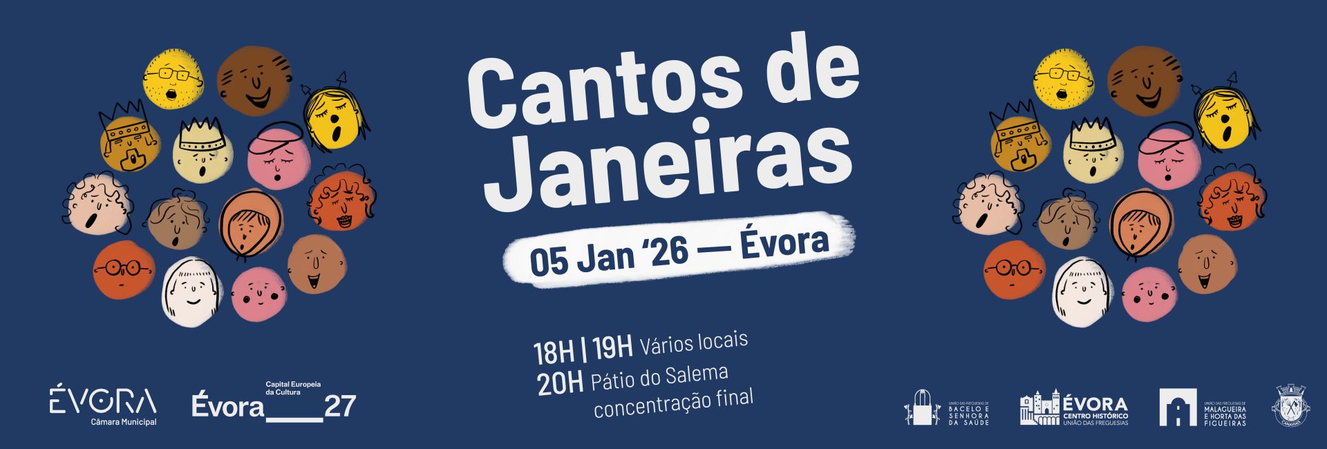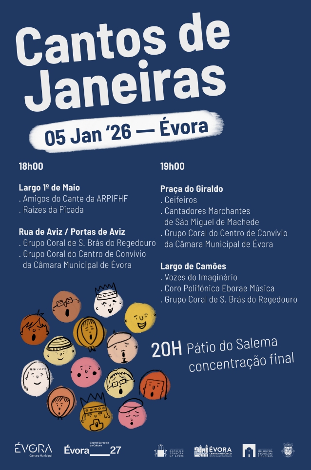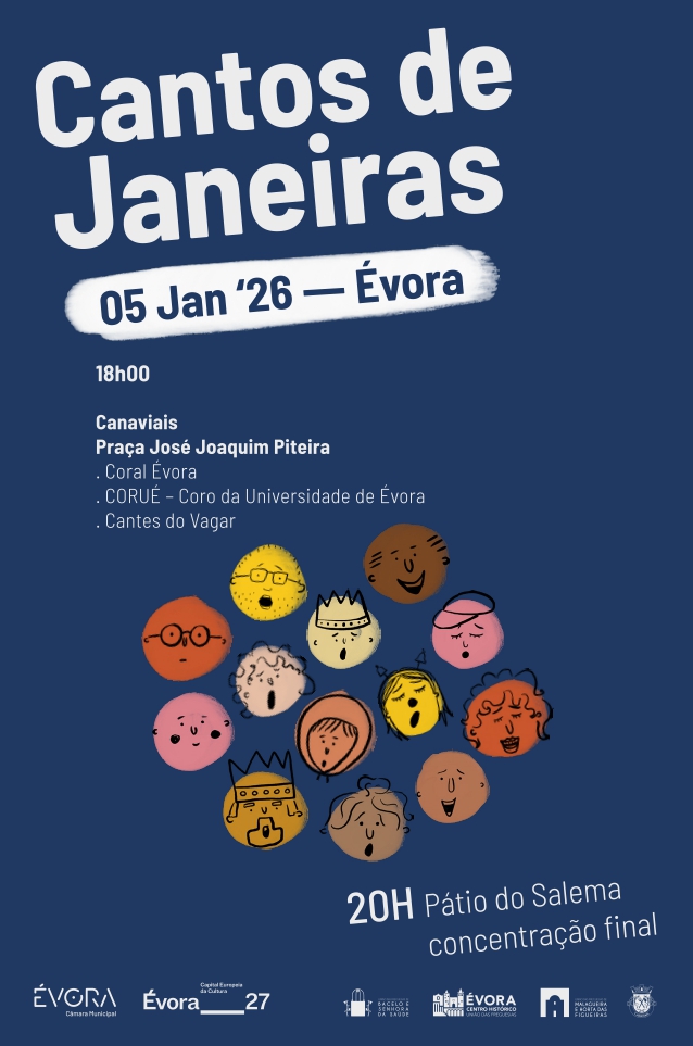 Atualizado em 22/12/2025Os Cantos de Janeiras voltam a fazer-se escutar, em Évora, para dar as boas-vindas a 2026. A tradição, que assinala o Dia de Reis, acontece na segunda, dia 05 de janeiro, a partir das 18h00, com atuações no centro histórico e nos bairros. No final, a partir das 20h00, todos os participantes convergem para o Páteo do Salema onde terá lugar um caloroso convívio com lume de chão e o tradicional petisco, para o qual se convida toda a população.
