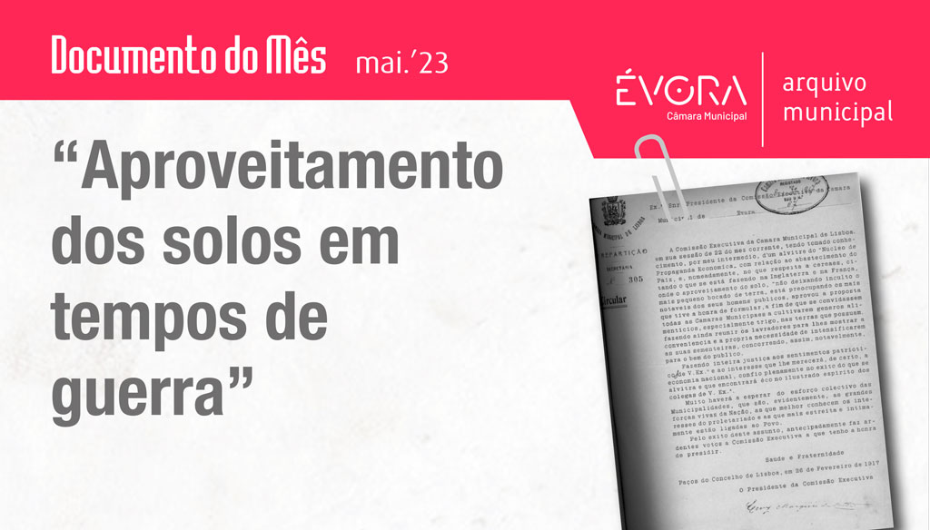 Em plena I Guerra Mundial as necessidades alimentares eram muitas, conforme constatamos por imensa documentação arquivada na correspondência trocada entre a Câmara Municipal de Évora e outras entidades. Hoje escolhemos para documento do mês de maio um ofício dirigido da Câmara de Lisboa a solicitar o apoio de outras Câmaras para que não se deixe de cultivar todos os terrenos porque a necessidade assim o justificava.